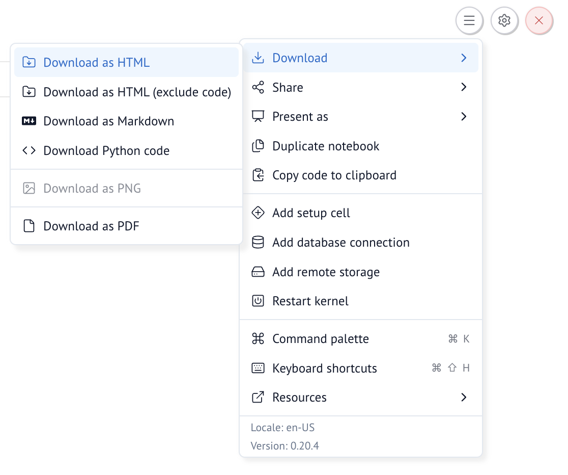 Additionally, you can configure individual notebooks to automatically save as HTML through the notebook menu. These automatic snapshots are saved to a folder called __marimo__ in the notebook directory.